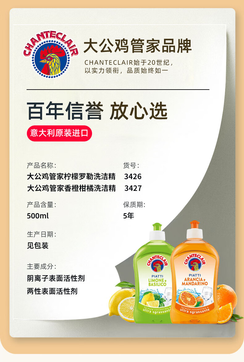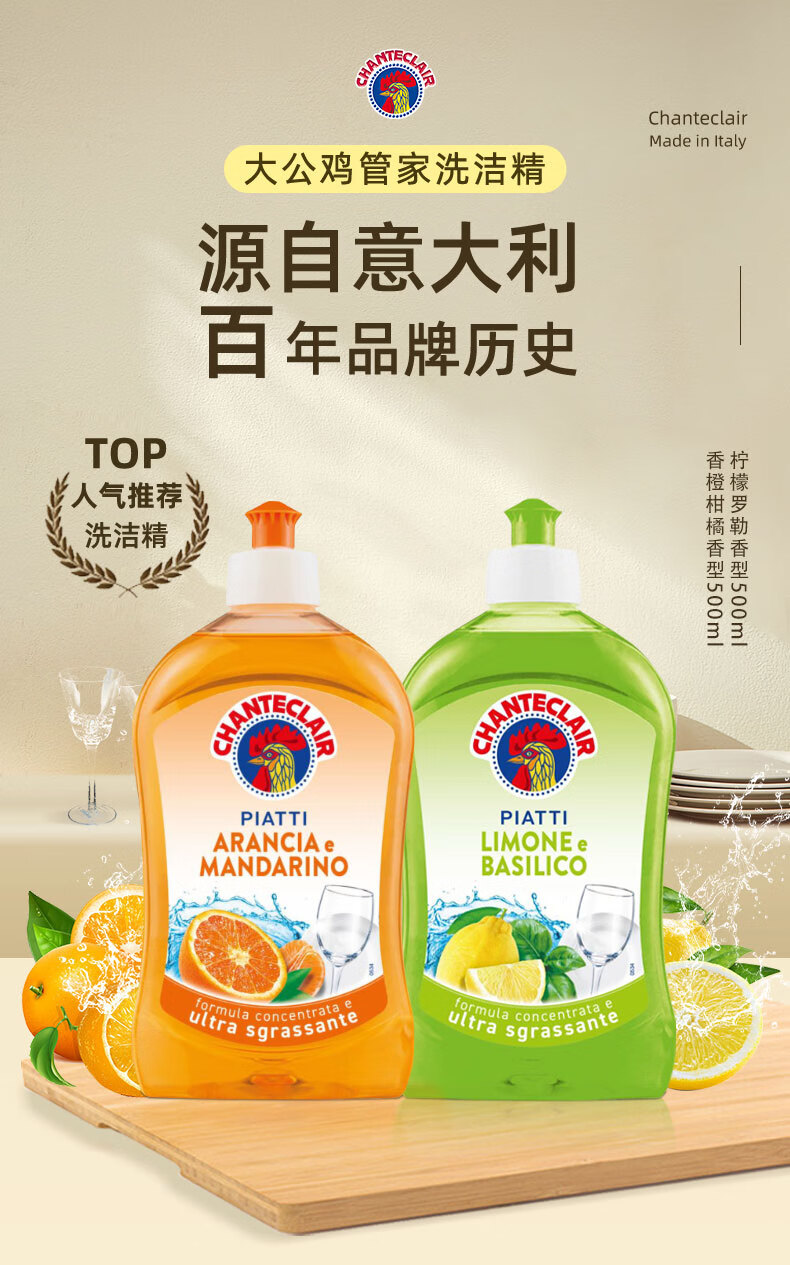 代发大公鸡管家 意大利进口 香橙+柠檬洗洁精500ml*2瓶组合 AJC041154
