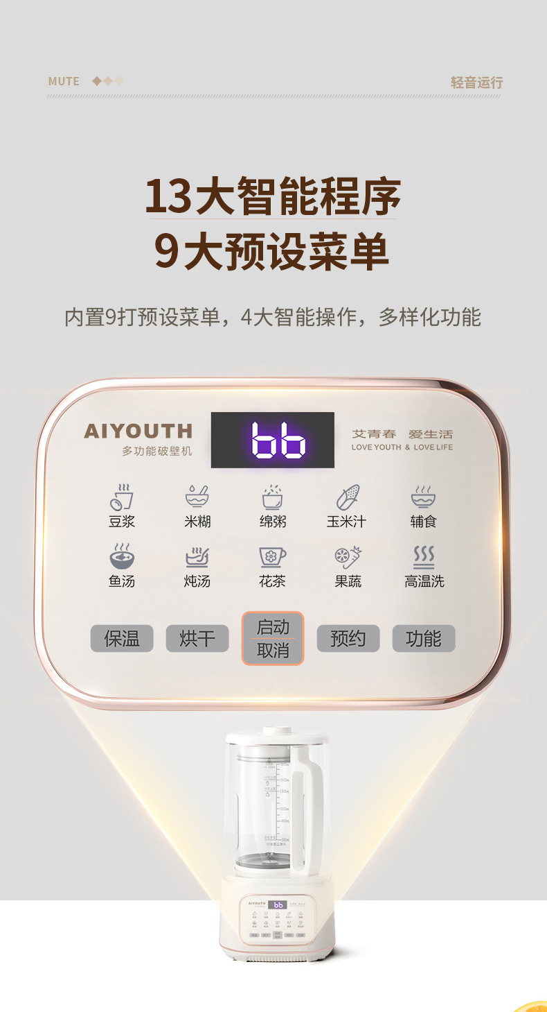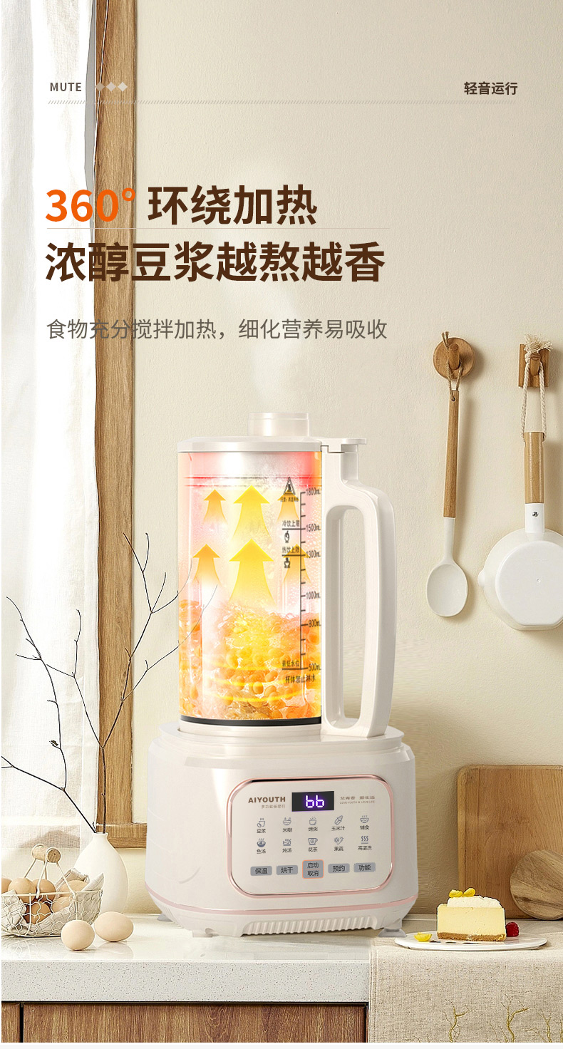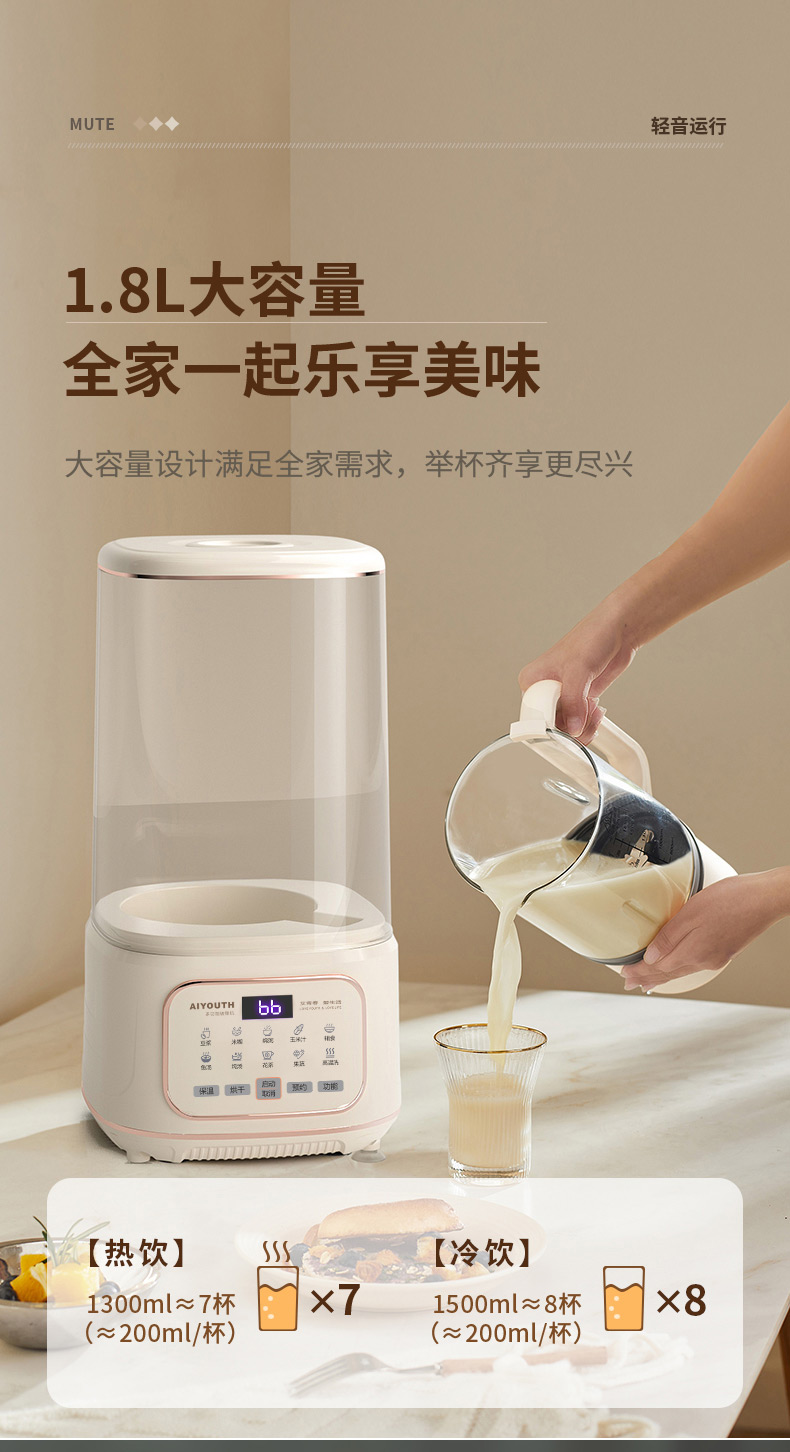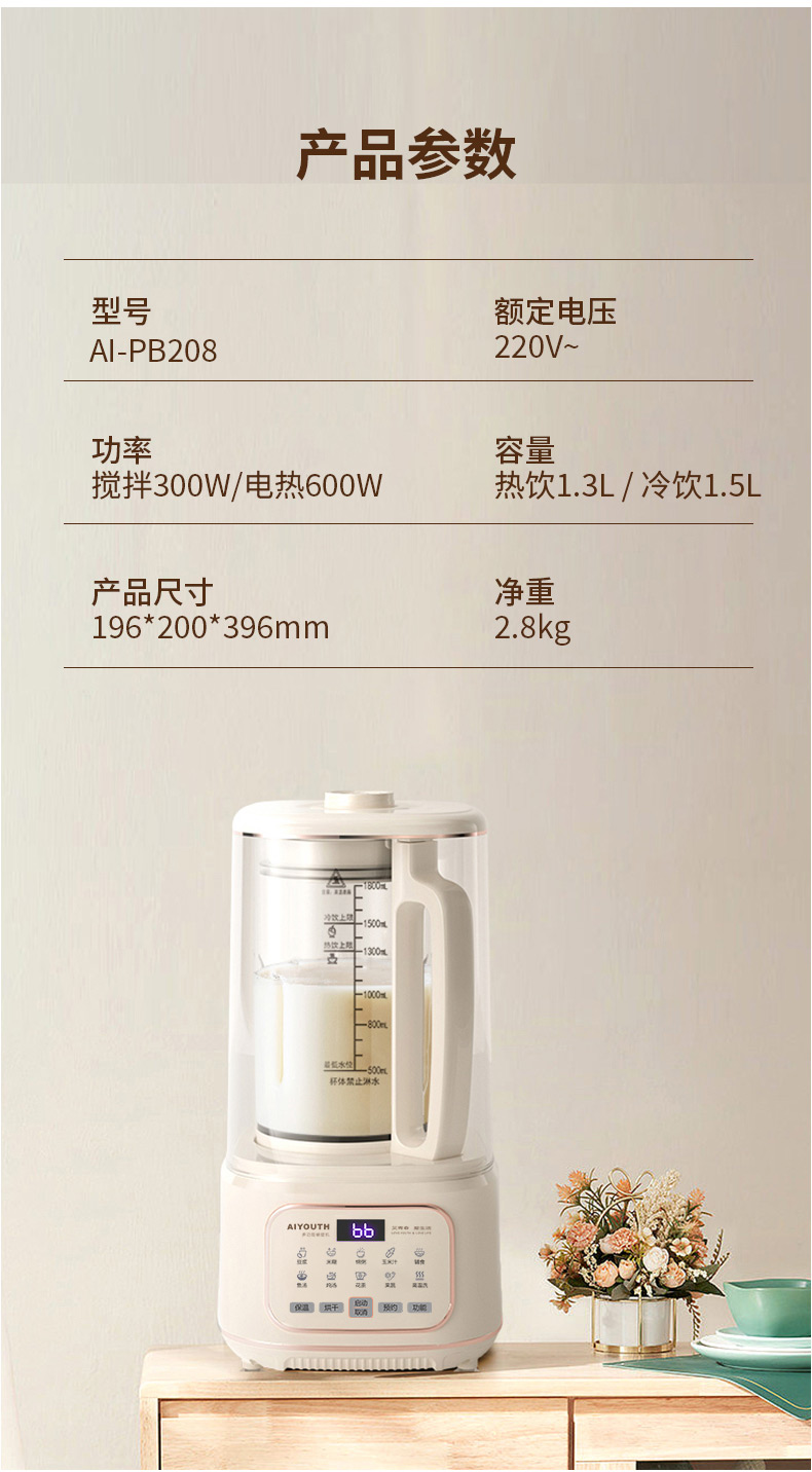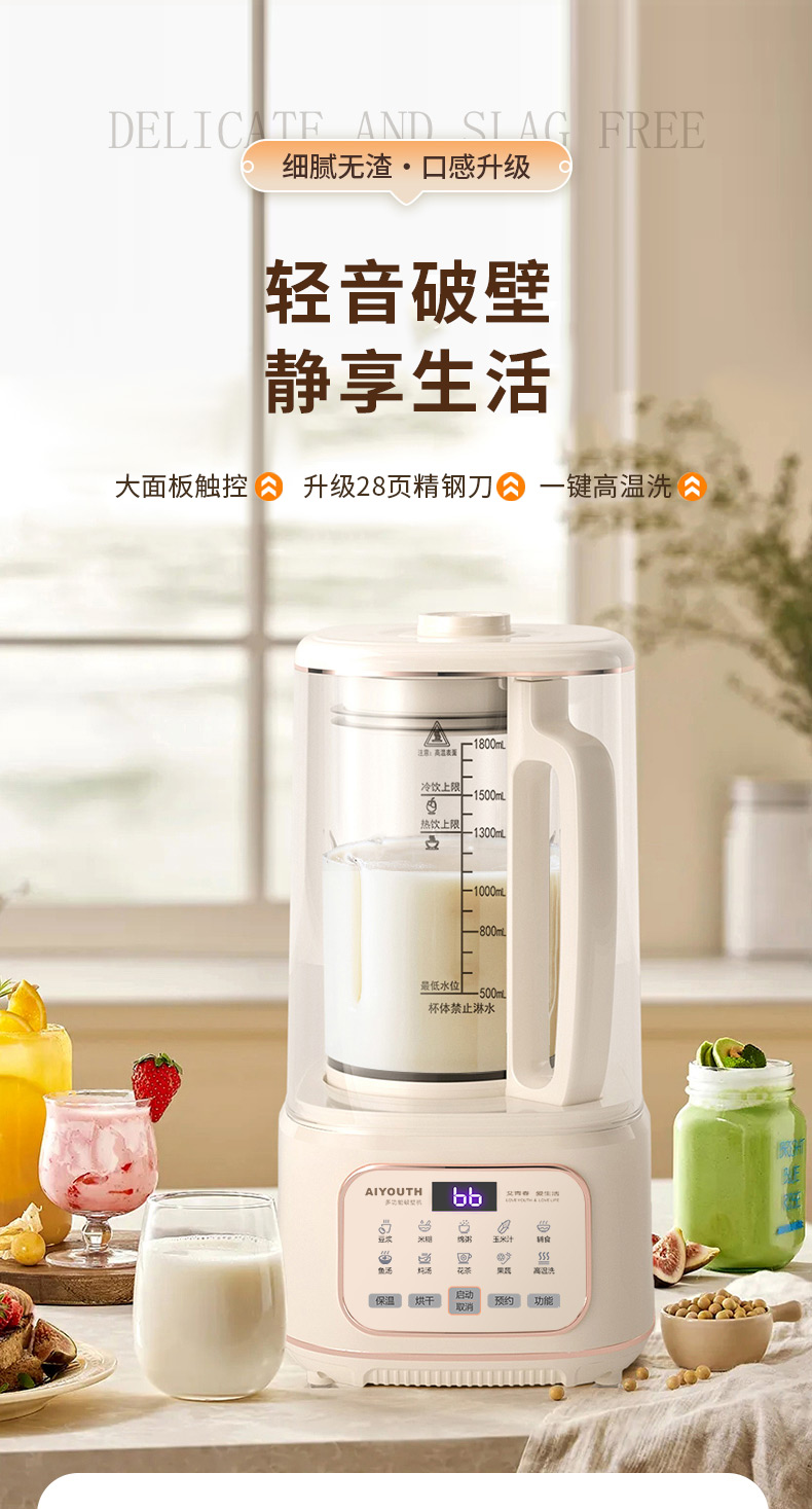 代发艾青春多功能破壁料理机 AI-PB208大容量1.8L 轻音破壁机