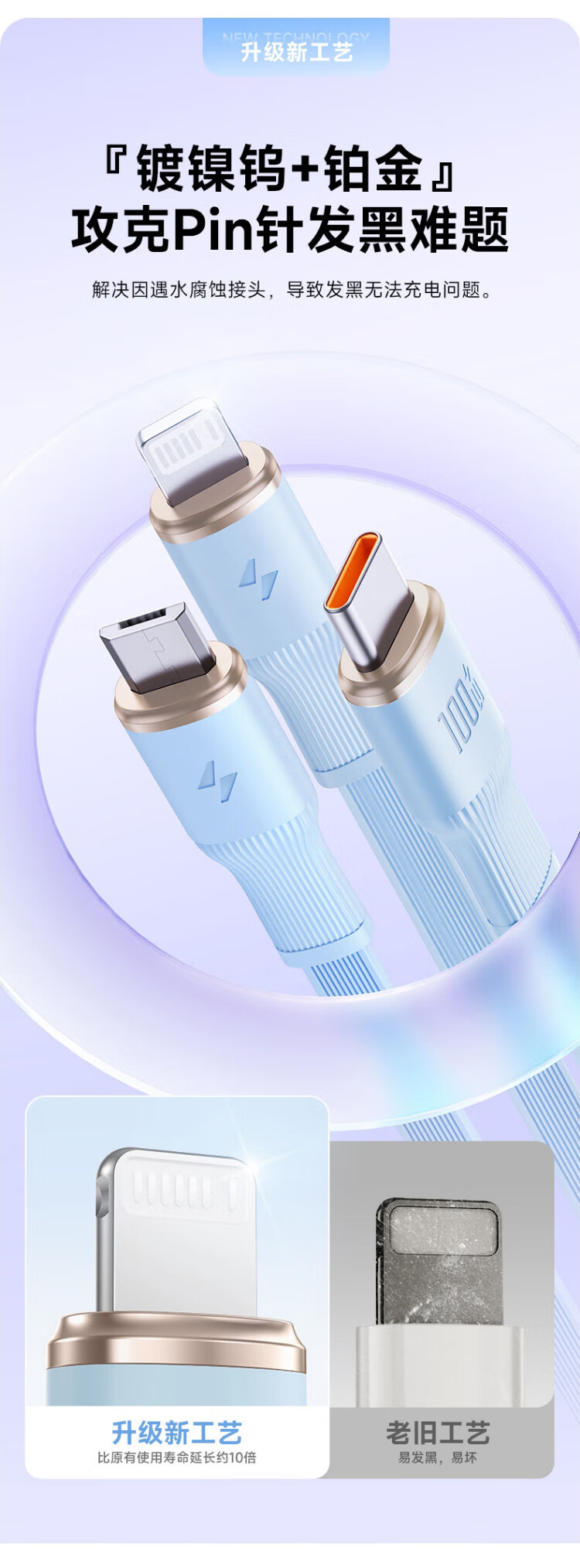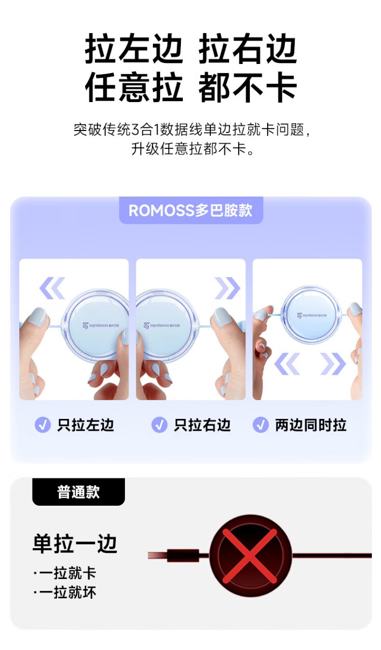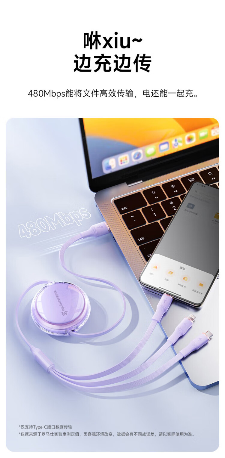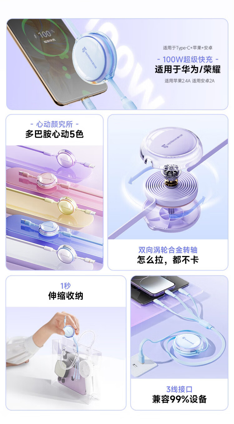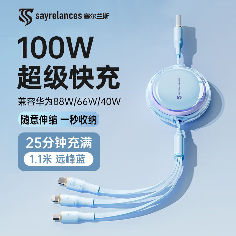 代发塞尔兰斯线三合一数据线6A快充100W 适用于苹果iPhone/华为安卓Typec手机车载充电线伸缩多功能 蓝色