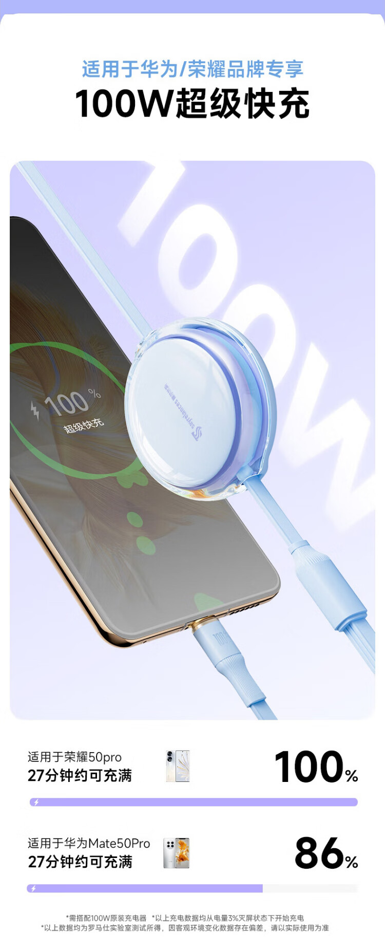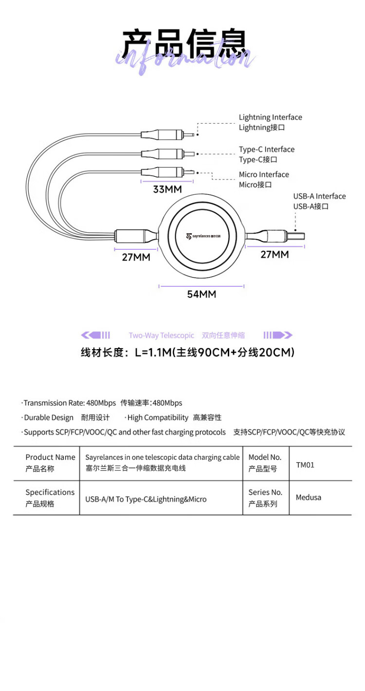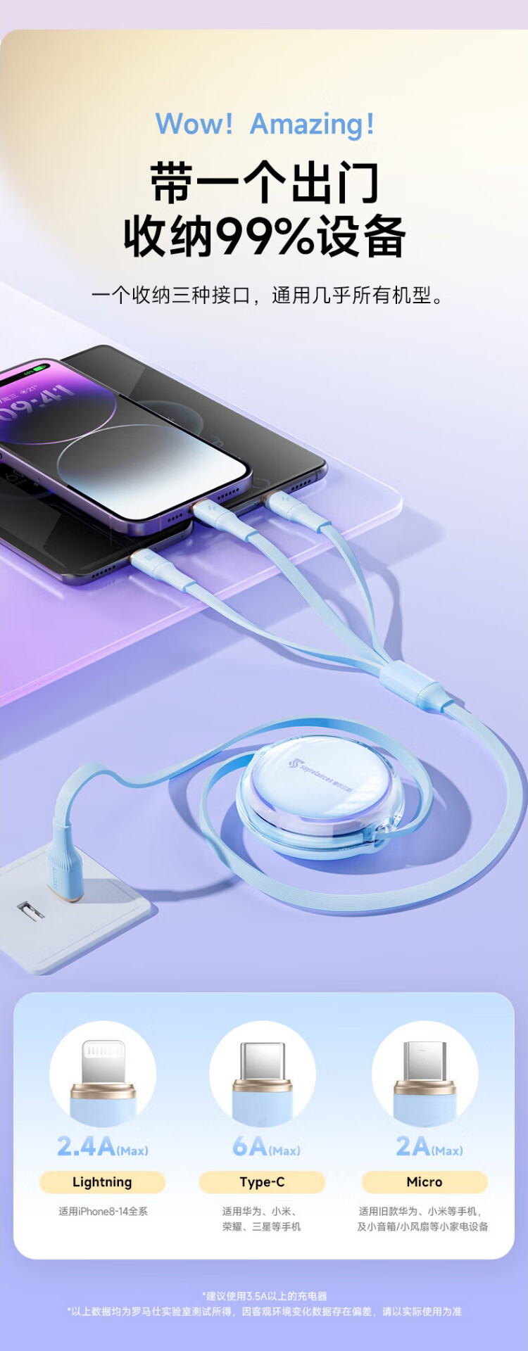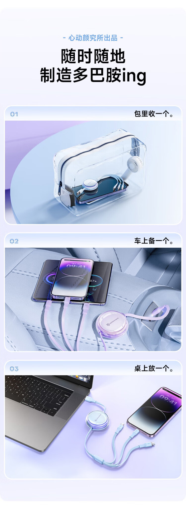 代发塞尔兰斯线三合一数据线6A快充100W 适用于苹果iPhone/华为安卓Typec手机车载充电线伸缩多功能 蓝色