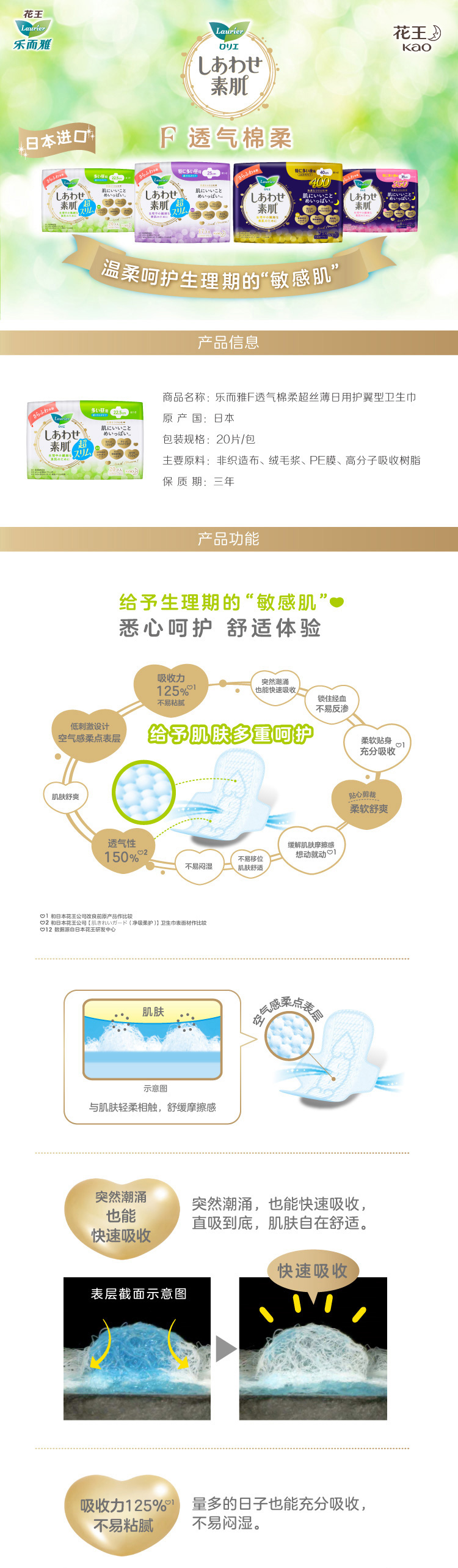 代发花王(kao)乐而雅F敏感肌透气系列卫生巾22.5cm20枚/包-丝薄款 AJC052743